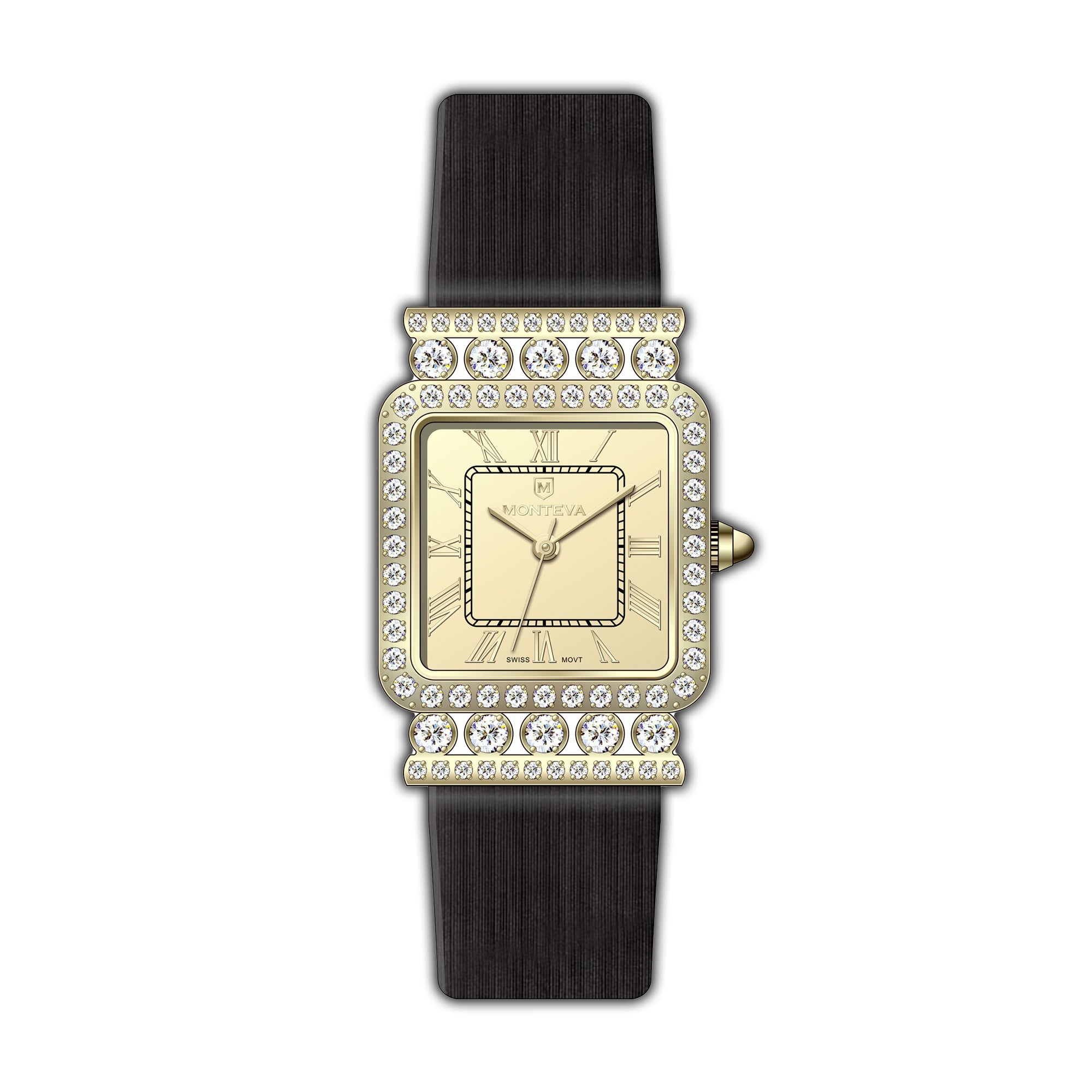 Exquisite Monteva ladies' watch (M479EGG) featuring a radiant rectangular gold-tone case encrusted with sparkling stones. The gold dial displays classic Roman numerals and is paired with a sophisticated black leather strap.